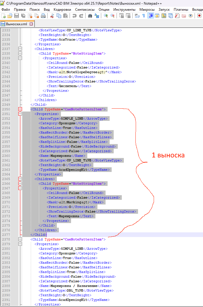 Открывается в текстовом редакторе xml-шаблон. Актуальные выноски будут последними добавлены. Копируете сруктуру и вставляете в нужный вам файл: