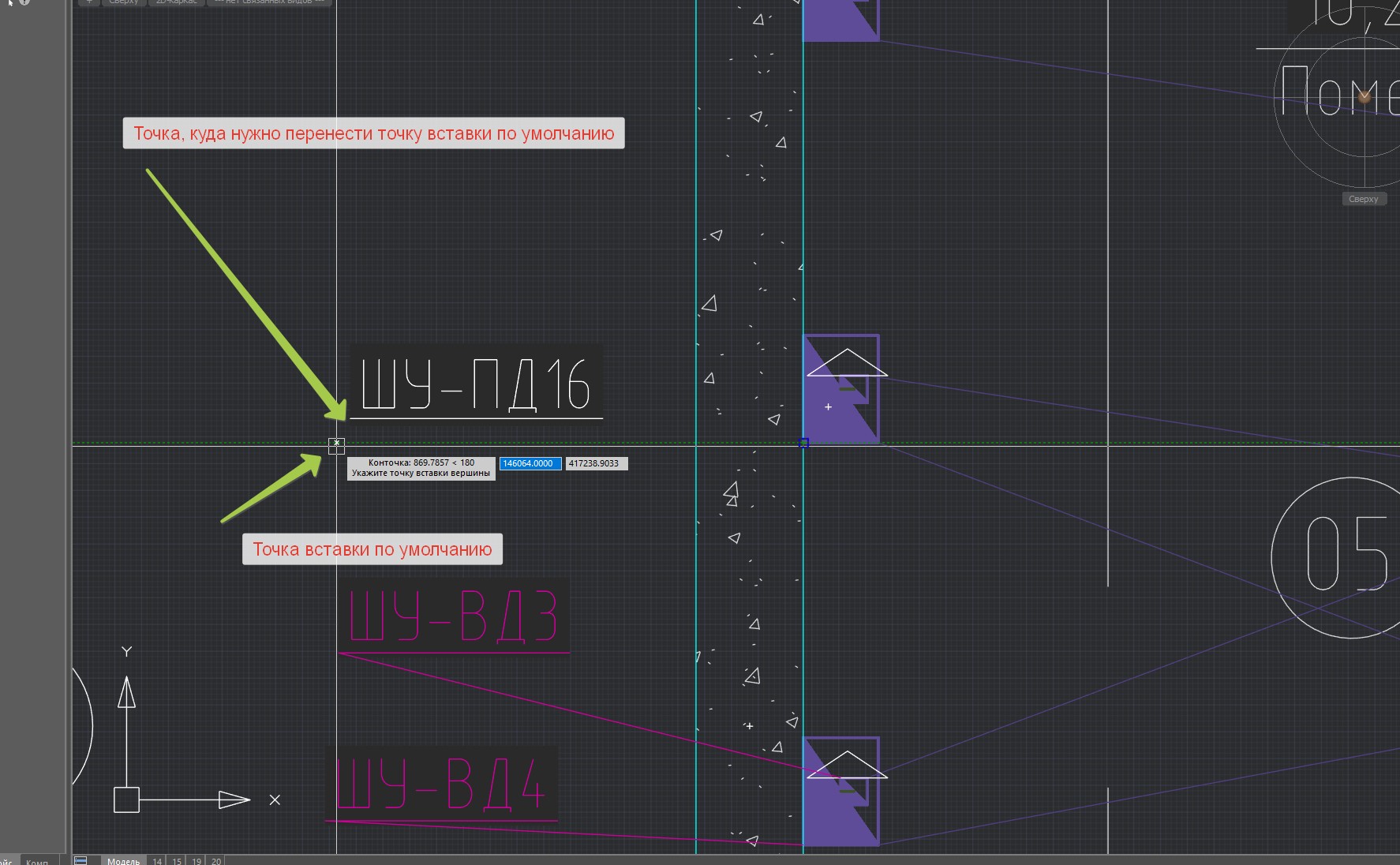 Прошу разработчиков уточнить, где в настройках можно заменить точку вставки начала выноски по умолчанию. Проблема (см. на рисунок - надеюсь понятно) в том, что точка выравнивания не совпадает с точкой вставки текста (“полки или рамки текста”), в результате после вставки нужно вручную переставлять “полку текста” ещё раз, чтоб выносная линия была без наклона, как изначально планировалось)