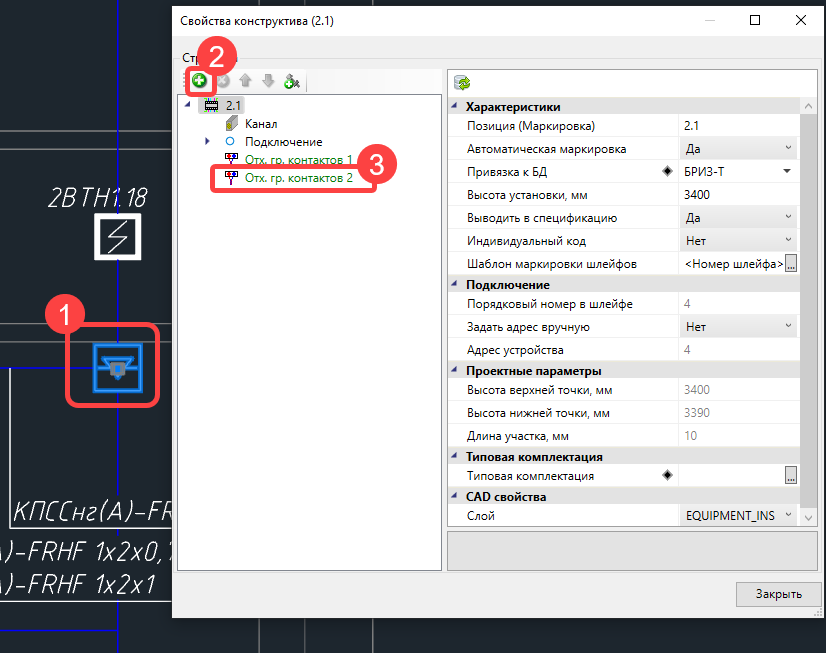 Изначально неизвестно, какую функцию будет выполнять БРИЗ, изолятора или разветвителя. Поэтому БРИЗ только подключается в ДПЛС, как изолятор. Если нужно ветвить ДПЛС, то в БРИЗ, в его свойствах на плане, нужно добавить группу контактов, без какого-либо изменения параметров этой группы контактов. В этом случае ответвление от БРИЗа программой будет считаться ответвлением ДПЛС с сохранением кольцевой структуры ДПЛС, т.е. строим кольцо с ответвлениями, как в этикетке на БРИЗ. Если нужно от БРИЗа 2 ветки, то добавляем две группы контактов.