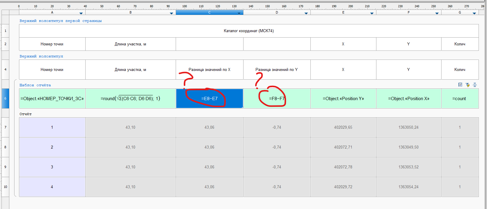 Логика была следующая, создаю два скрытых столбца “Разница значений по Х” и “Разница значений по Y” в формуле которых должна браться координата следующей точки (например точки 2) и вычитаться координата предыдущей (например точки 1) а потом вот по такой формуле =round(sqrt(sum(C6C6;D6D6)); 1) высчитывается расстояние между этими точками 1 и 2 и т.д.