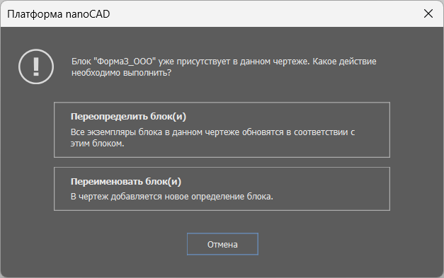 подскажите пожалуйста, возможно ли отключить сообщение в nanoCAD 26, чтобы работало как в предыдущих версиях (*когда много блоков - выходит куча таких окон, это вызывает проблему):