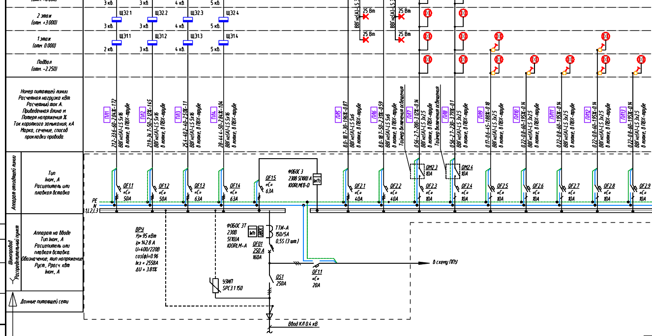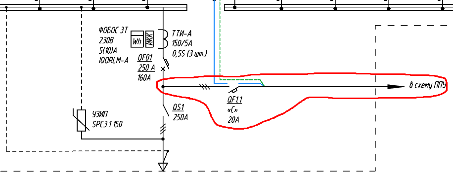 На вводной фидер вы назначаете аппараты: QS (Рубильник), QF (к ППУ), QF (На секцию).