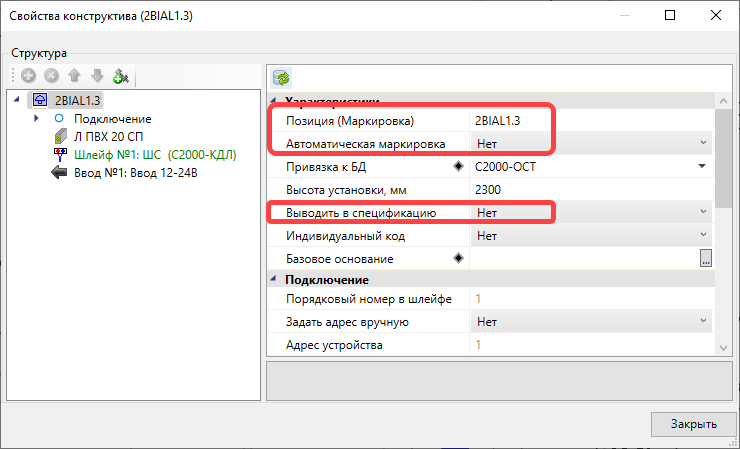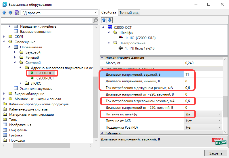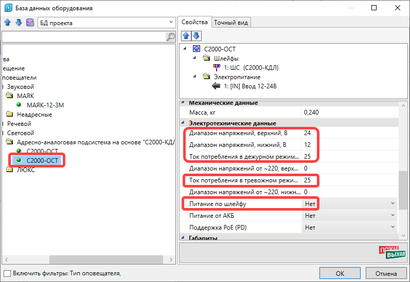 Далее, установить рядом с УГО табло ОСТ например УГО светового оповещателя и при выборе из БД создать копию ОСТ в БД и назначить для питания Питание по шлейфу в значение Нет, ввести параметры питания от РИП.
