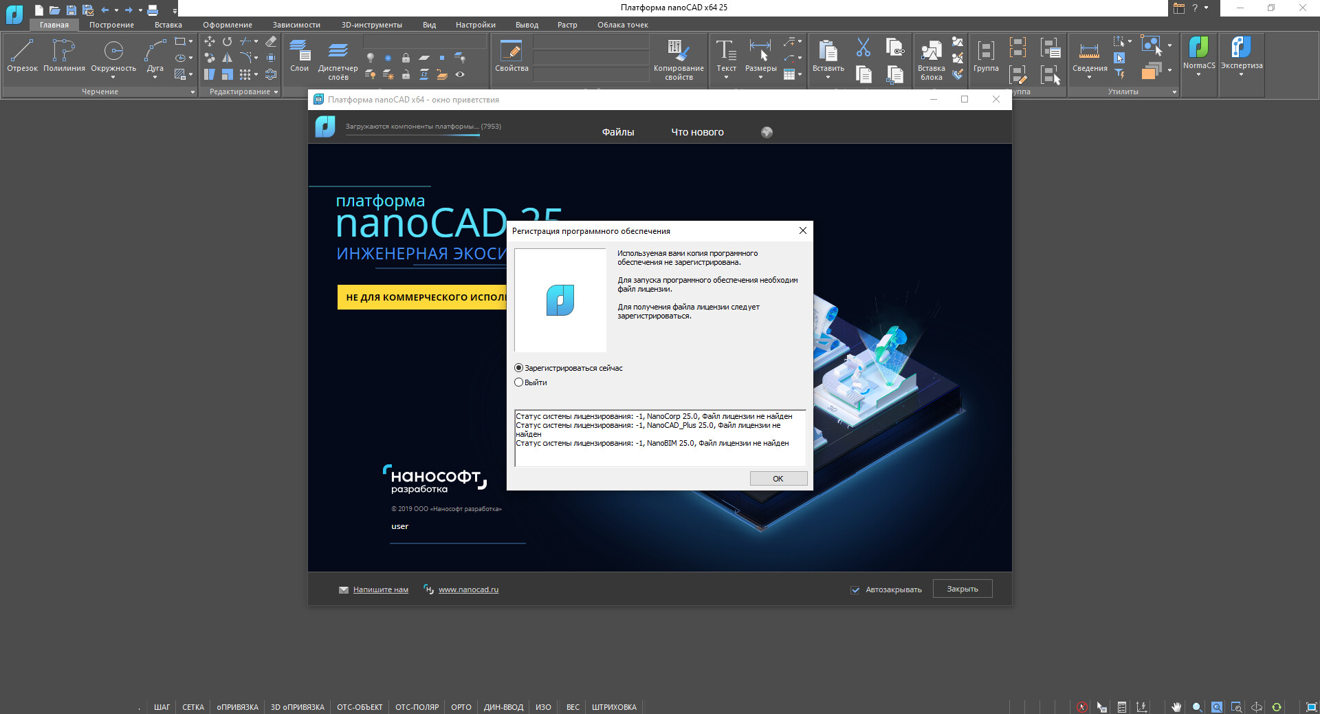 На почту пришло сообщение - Ваша лицензия на продукт “Платформа nanoCAD” (версия “25.0”) была успешно подтверждена.