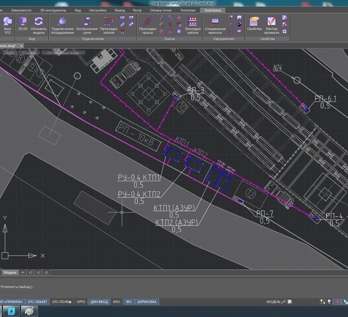 Добрый день. Кто то сможет подсказать. Вот на общем плане есть задача показать прокладку кабеля 10 кВ от от одной точки (Пусть будет РП-10) до другой (просто точка на чертеже, ее тоже бы кк то обозначить - конечная коробка или точка подключения), чтобы потом это участок включился в кабельный журнал.