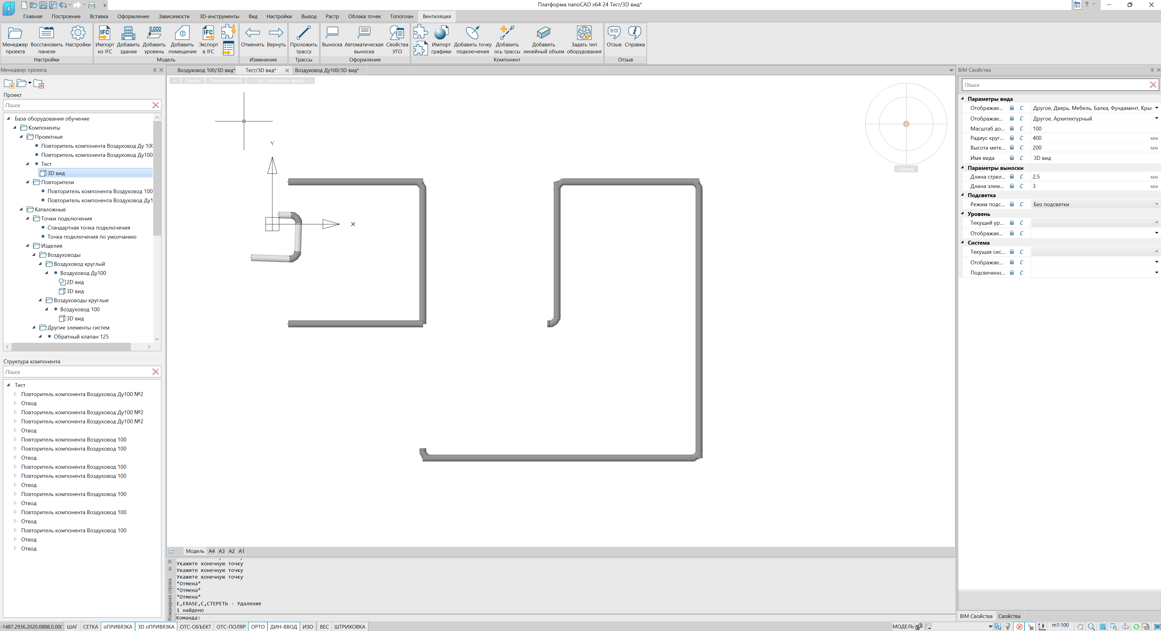 Продолжаю. Перехожу к тесту и начинаю прокладку трассы, выбираю Конструкцию, начинаю отрисовку и отсутствует обрезка по длине! А так же нет соединения с отводом в конце трубы. В начале трубы соединение отображается как надо. На скрине ниже светло-серым цветом выделен компонент из другого готового проекта, отвод с ним соединяется адекватно.