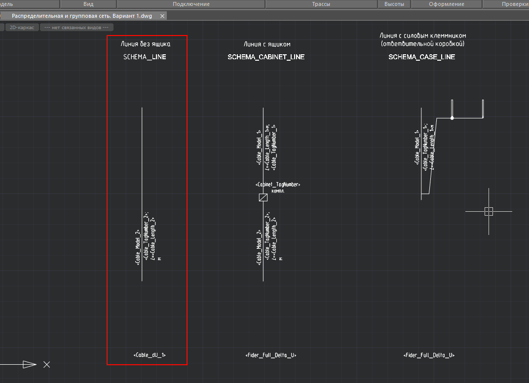 Теперь стало яснее, нужно будет вернуть назначение “Распределительный”, а также вам нужно будет откорректировать шаблон схемы. А именно доработать блок трассы “SCHEMA_LINE” добавить в блок видимость, как это сделано в блоке “SCHEMA_CASE_LINE”. За основу можно взять шаблон с именем “Распределительная и групповая сеть. Вариант 1”. Почитать можно в руководстве пользователя и в методичке (https://lk.nanocad.ru/download/bim_electro_methodological_recommendations/)