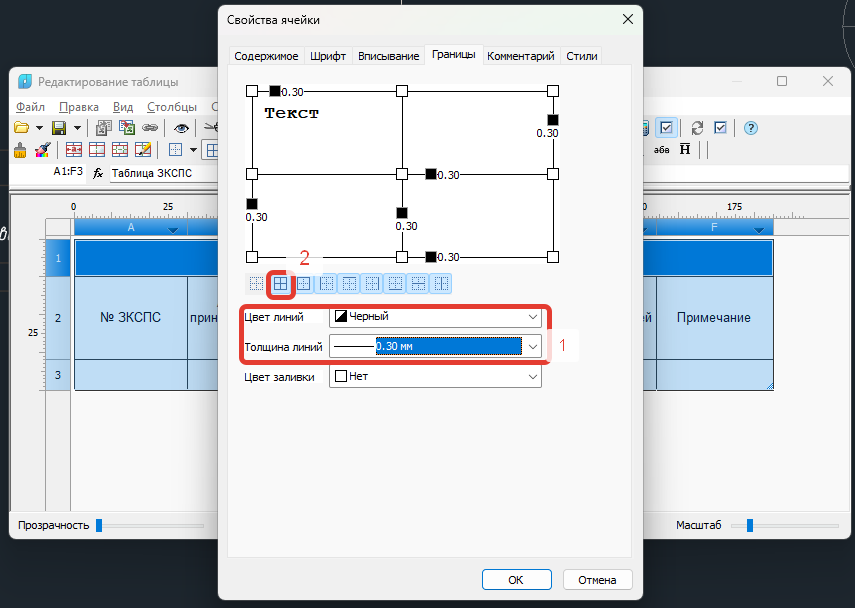 Двойной клик на таблице nanoCAD, Ctrl+A, меняем свойства