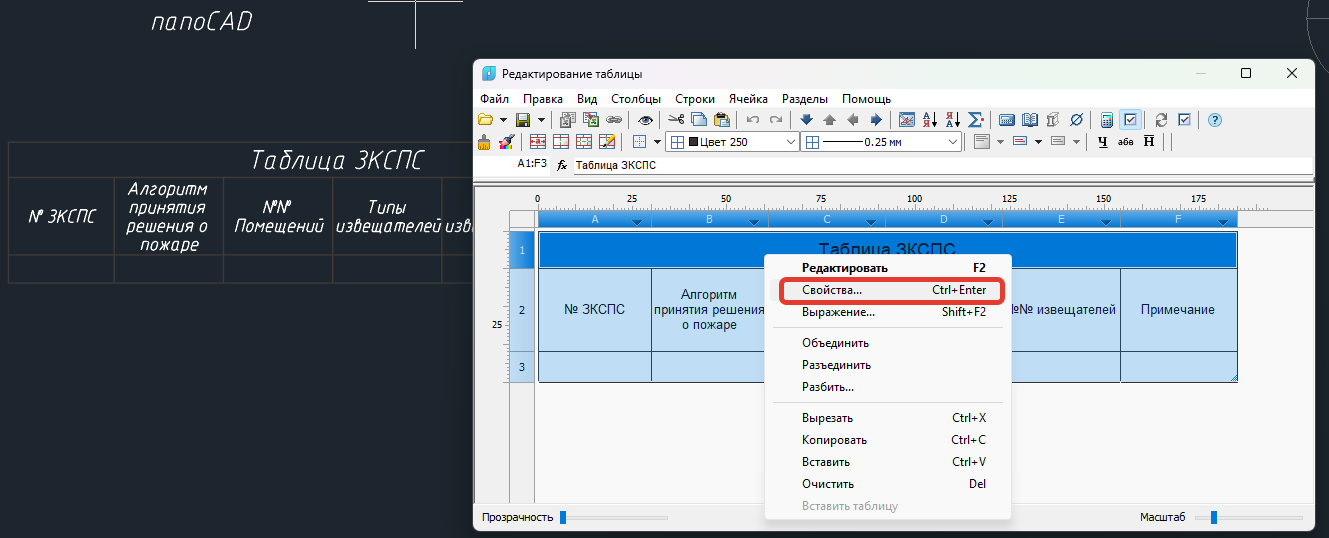 Открываем dwg с шаблоном таблицы. Например, C:\ProgramData\Nanosoft\nanoCAD BIM ОПС x64 25.1\Report\FireZoneReport.